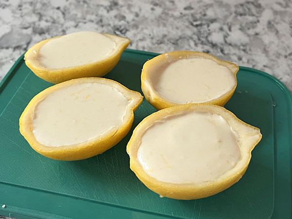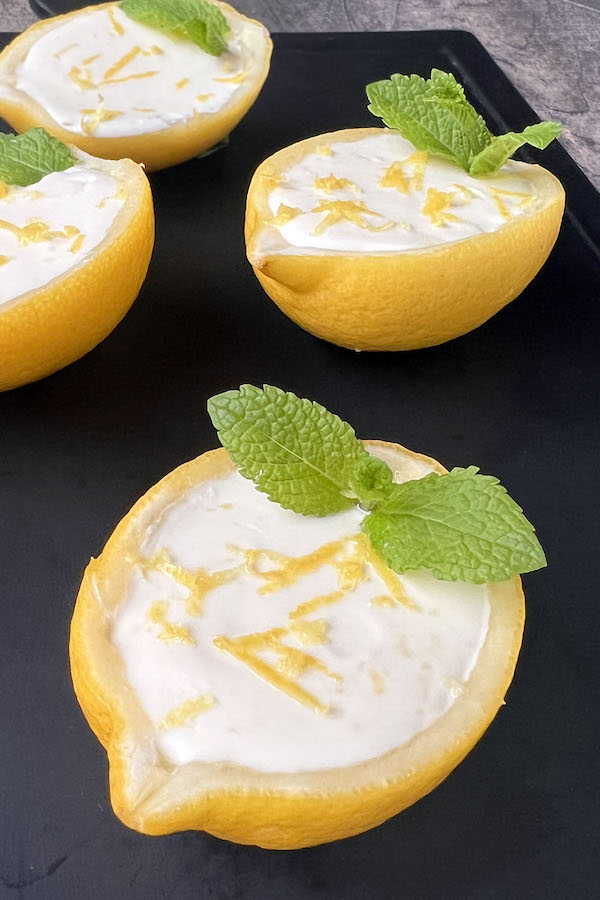 1. Cut lemons in half and using a knife carefully cut around the flesh. Use a spoon to gently remove the lemon flesh from each lemon half, being careful not to tear the skins. Set aside the hollowed-out lemons (lemon shells), as you'll be filling them later. 2. In a small saucepan, heat the heavy cream over medium heat until it's hot but not boiling. 3. Once the cream is hot, add the powdered sugar, lemon zest, and lemon juice. Stir well to combine all the ingredients thoroughly. 4. Turn off the heat and carefully fill the lemon skins with the cream mixture. 5. Place the filled lemon skins in the refrigerator for 1-2 hours to allow the lemon posset to set. 6. Before serving, garnish each lemon posset with fresh mint leaves or fresh berries (like fresh raspberries or blackberries for extra flavor) and additional lemon zest. 7. To store this lemon dessert, cover it with plastic wrap or place it in an airtight container and refrigerate. Enjoy within a day or two for the best taste and texture.