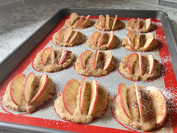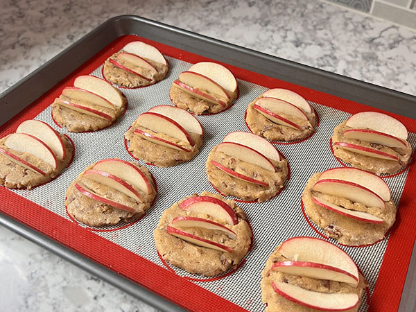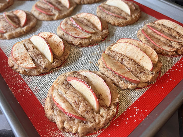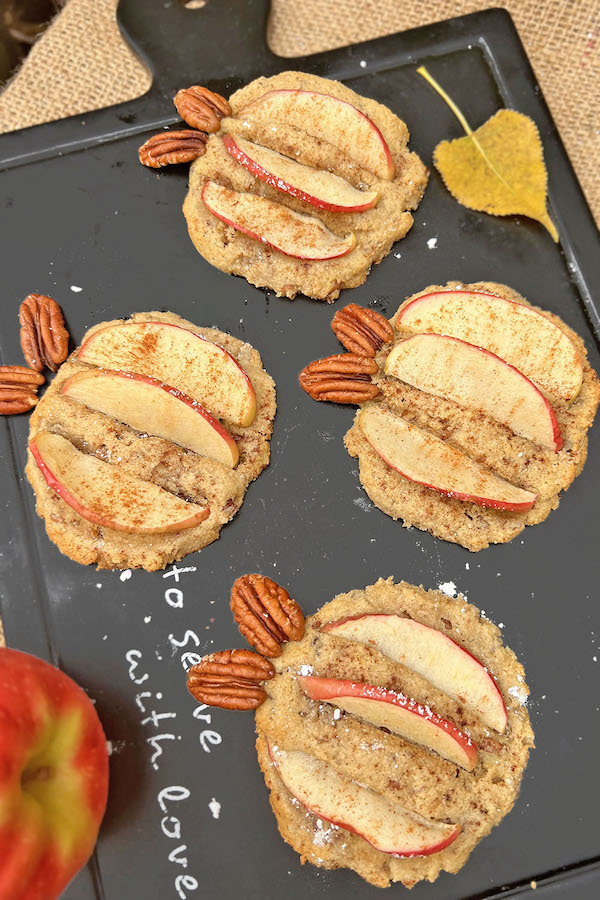 They're a healthier cookie option you can feel good about indulging in. The addition of fresh apple slices transforms these delicious cookies into cozy treats, reminiscent of the fall season. A touch of cinnamon and powdered sugar adds a hint of spice, while pecan halves mimic leaves for a delightful finish and extra layer of nutty flavor.