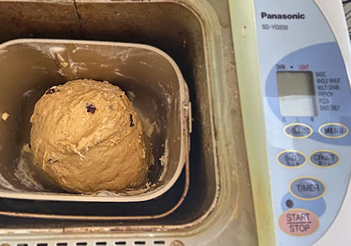 2. Use any setting for a few minutes just to mix together the ingredients (I used pizza dough setting) to check if the dough consistency is good (it should be slightly sticky). You may need to use a silicone spatula to scrape down the dough. Adjust by adding a tablespoon of milk (when too dry) or flour (when too thin), but only if necessary.