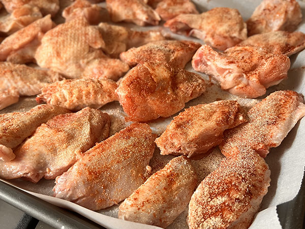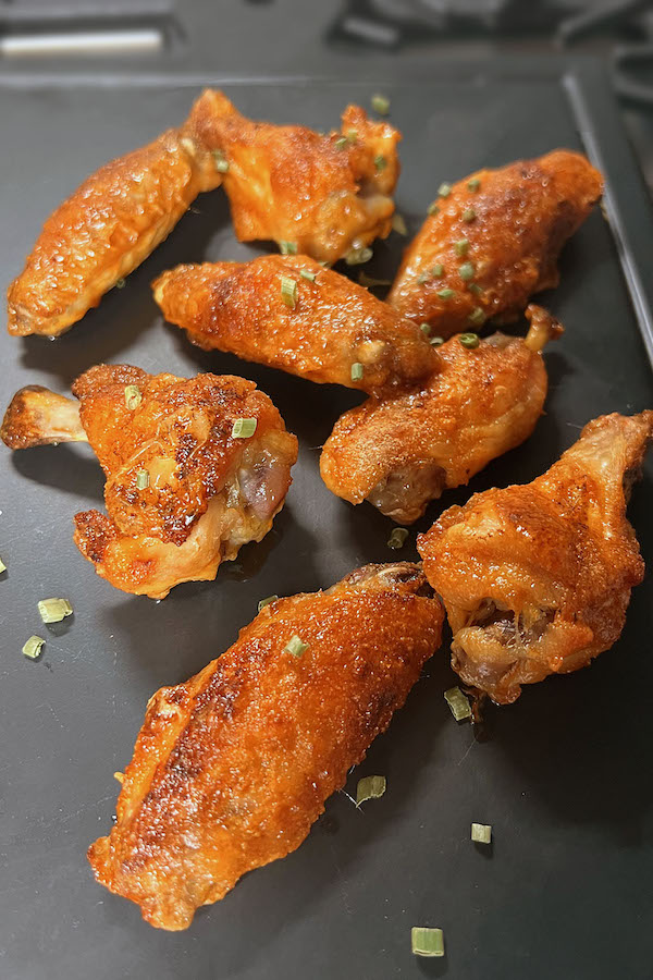 1. Разогреть духовку до 200C (400F). Обсушить крылышки бумажным полотенцем. 2. Выложить на противень (я застилаю противень бумагой для выпечки, чтобы проще было его мыть). Посыпать разрыхлителем, паприкой, сушеным молотым чесноком, сушеным молотым луком и солью. 3. Запекать в разогретой духовке 45 – 50 минут, до желаемой степени корочки. 4. В это время подготовить соус. В миске смешать растопленное сливочное масло, острый соус, Вустерширский соус и молотый чеснок; хорошо перемешать. 5. Полить крылышки соусом. 6. Аккуратно перемешать, чтобы крылышки покрылись соусом со всех сторон, посыпать нарезанным зелёным луком и подавать.