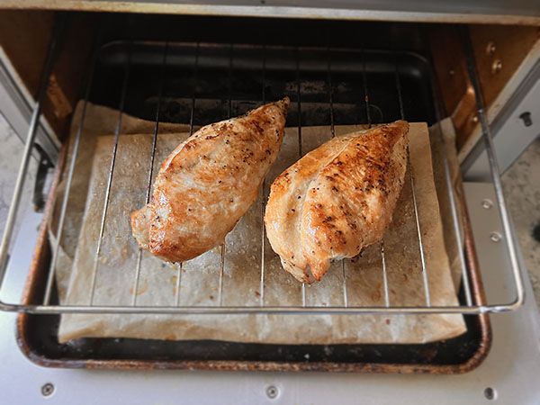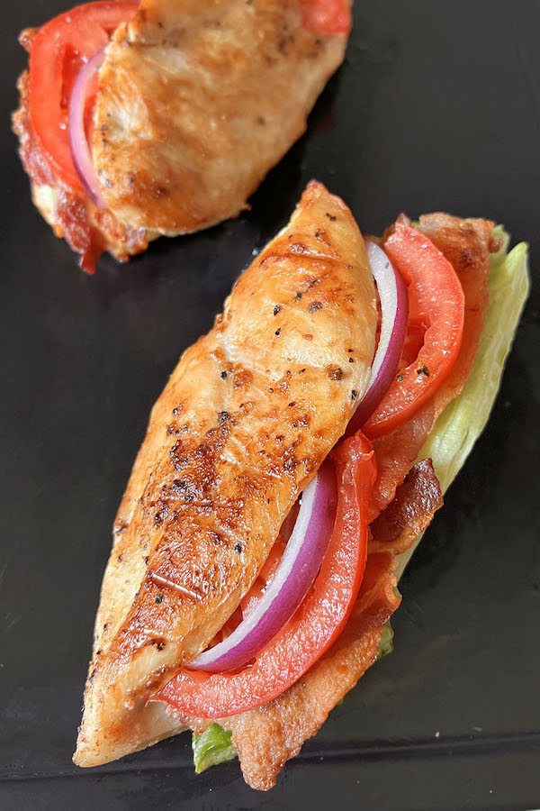 1. Preheat oven to 380F (190C). 2. Butterfly chicken: slice each chicken breast in half horizontally 3/4 way through. Season with onion powder, garlic powder, salt and pepper on all sides. 3. Heat oil in a skillet over medium-high heat. Open each chicken breast and sear cut side down for a minute (not longer than 2 minutes, otherwise it might become difficult to close it back), close back and sear one side for about 3 minutes, turn and sear the other side for another 3 minutes. 4. Transfer to the oven and cook for another 5-7 minutes, until the internal temperature is 165F (74C). 5. Meanwhile, prepare the veggies and bacon. 6. Spread some mayo inside each chicken breast, add lettuce, bacon, tomato and onion slices. Serve.