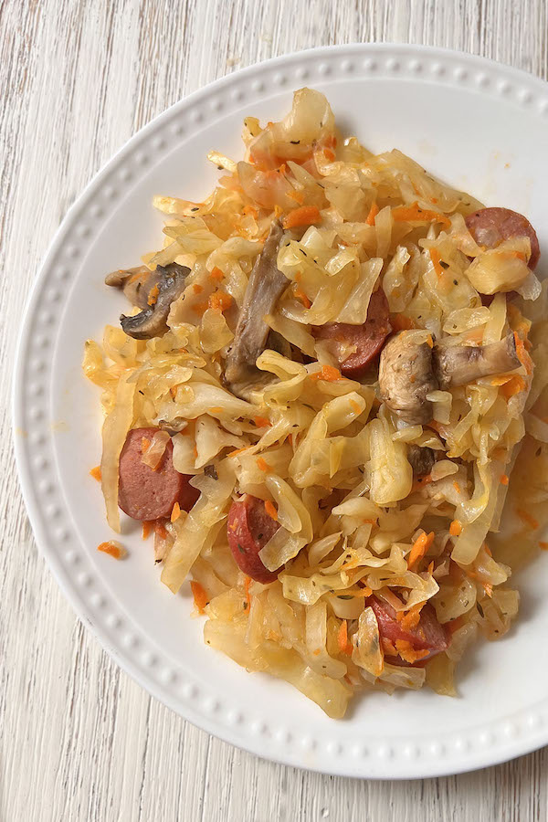 This easy braised cabbage recipe uses simple and inexpensive ingredients to make a delicious, healthy meal. You will be making cabbage way more often if you try this green cabbage recipe loaded with bacon, sausages, and mushrooms. Recipes with cabbage can be served as a main dish or a side, tastes great both hot or cold. I hope you fall in love with this cabbage and sausage recipe!