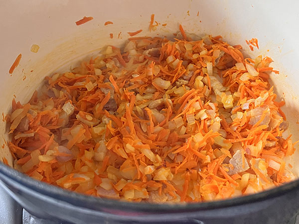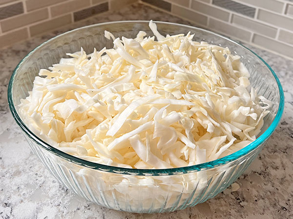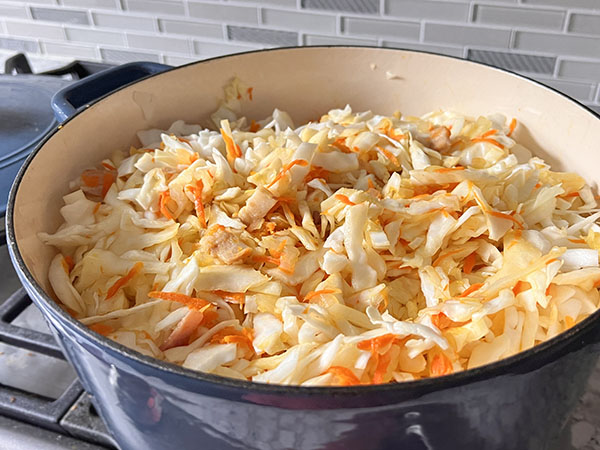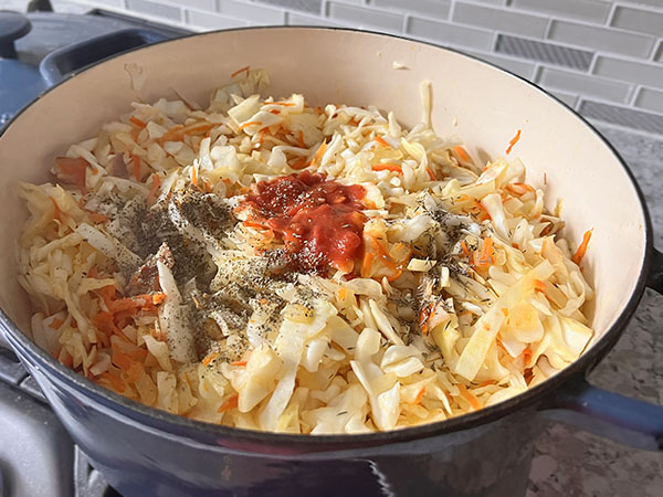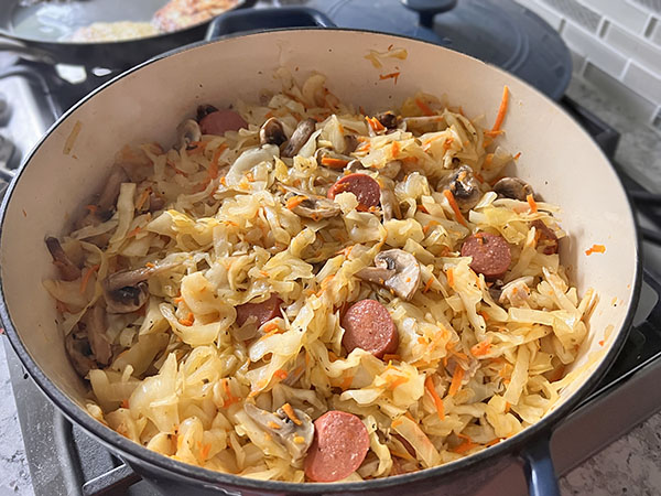 1. Heat Dutch oven over medium-high heat. Add chopped bacon, cook for 2 minutes. Add chopped onion and shredded carrots, cook for 8 minutes. 2. Add shredded cabbage, chicken broth, 1 teaspoon salt and stir. Cover and cook for 10 minutes (salt will draw out excess moisture from cabbage), just enough for our needs. 3. Add tomato sauce, marjoram, basil and thyme. Stir and cook on low, covered, for another 15 minutes. 4. Add sliced mushrooms and sausages. Season with salt to taste, cover and cook for 15 minutes. Enjoy!