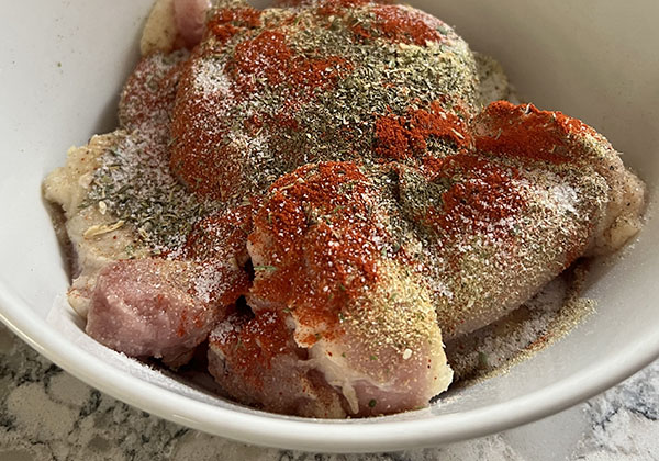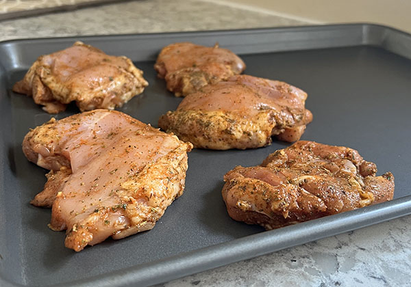 1. Preheat oven to 400F (200C). 2. In a large bowl, combine chicken thighs, Italian seasoning, garlic powder, onion powder, paprika and salt. Mix well. 3. Arrange chicken thighs on one side of a baking sheet. Bake for 12 minutes. 4. Meanwhile, toss asparagus with oil and salt. Toss mushrooms with oil, salt, thyme and garlic powder. 5. Remove the baking sheet with chicken from the oven, add asparagus to the other side of the sheet, arrange mushrooms around chicken. 6. Bake for another 12 minutes, until asparagus is still slightly crispy and internal chicken temperature is at least 165F (74C). Remove from the oven, drizzle asparagus with lemon juice. Enjoy!