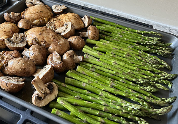 Chicken thighs, asparagus and mushrooms make a healthy, delicious, low carb dinner. This dish is going to become your favorite chicken dinner recipe for busy evenings. It’s simple, but hard to beat!