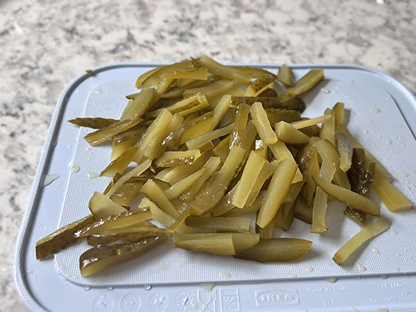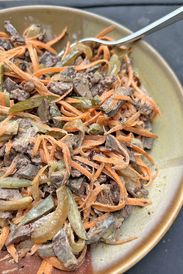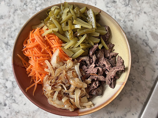 7. In a bowl, combine liver, marinated carrot, onion, pickles.