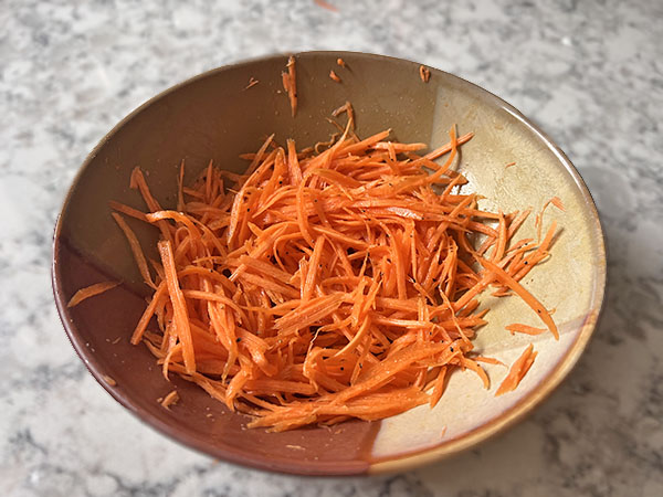 1. Julienne carrot (or cut into thin strips), transfer to a bowl. Add the marinade ingredients: vinegar, avocado oil, garlic powder and dry coriander. Season with salt and pepper, stir and let marinate, while preparing the rest of the ingredients.