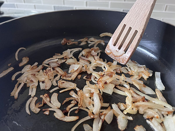 2. Heat half of the avocado oil in a skillet over medium high heat. Add sliced onion and cook for about 7 minutes, until soft. Transfer to a plate.