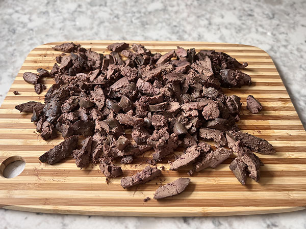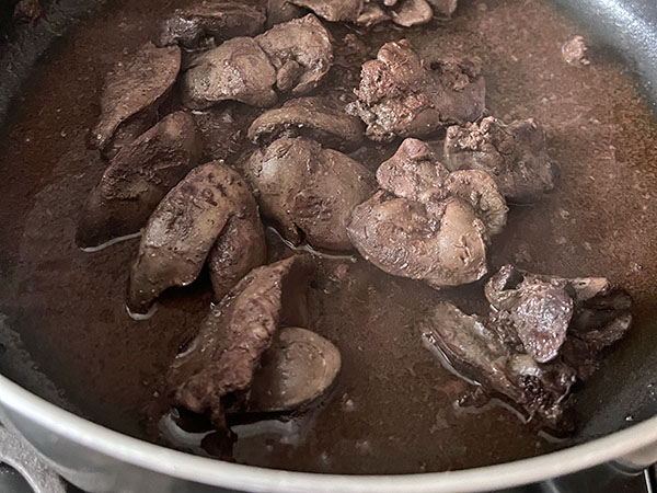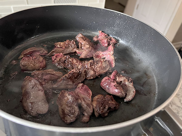 3. Add the rest of the oil to the same skillet, sear liver pieces for about 3-4 minutes per side, season with salt, add a little bit of water, cover and cook for another 5-7 minutes, until cooked through. Transfer to a plate to cool.