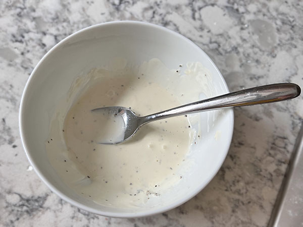 6. In a small bowl, prepare the dressing. Combine mayo, sour cream and water (you can omit water if the mixture is thin). Season with salt and pepper.
