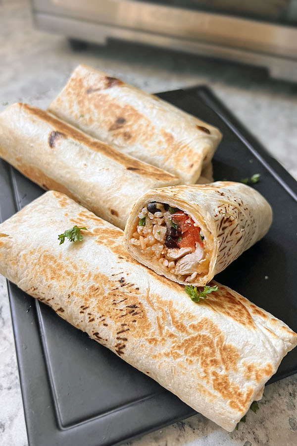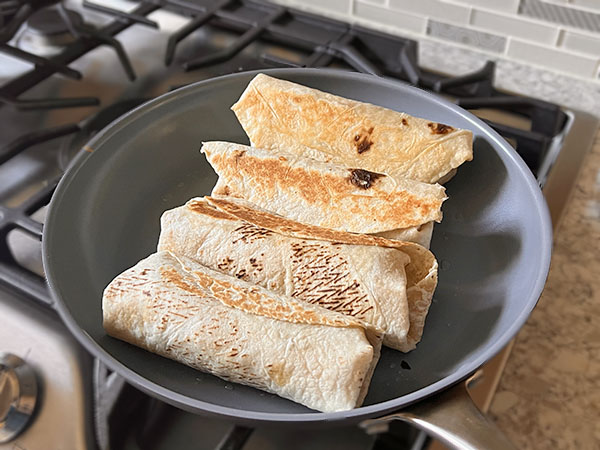 6. Heat a large, lightly coated with oil skillet over medium heat. Then add the burritos seam side down. Cook until golden brown, about 3 minutes. Flip and cook for a few minutes more.