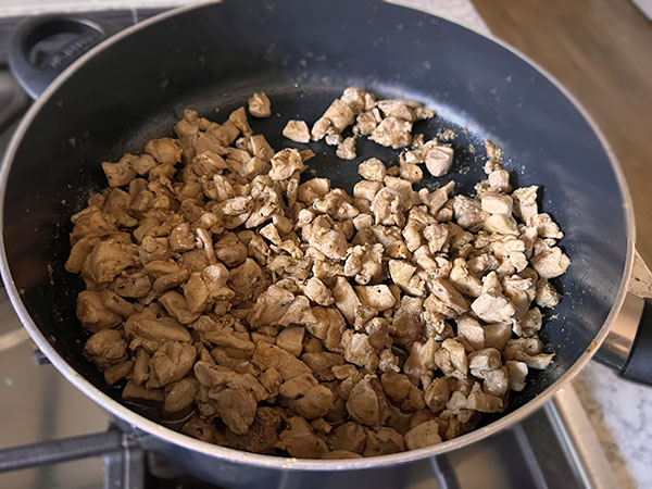 2. In another skillet, heat 1 Tablespoon avocado oil over medium-high heat. Toss cubed chicken with cumin, chili powder, oregano, salt and pepper. Add chicken pieces to the skillet and cook for about 5 minutes per side, until cooked through. When finished cooking, add lime juice and stir.