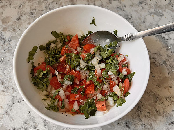 3. Prepare the salsa. Cut tomatoes into cubes, chop onion and cilantro. Add salsa ingredients to a small bowl, add lime juice, season with salt and pepper and mix to combine.