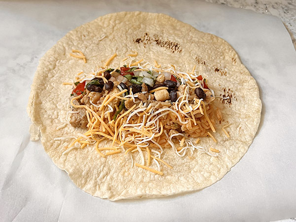 4. Assemble the burritos. Spoon about 3-4 Tablespoons of rice on each tortilla. Top with some chicken, beans, salsa. Finally, top with cheese.
