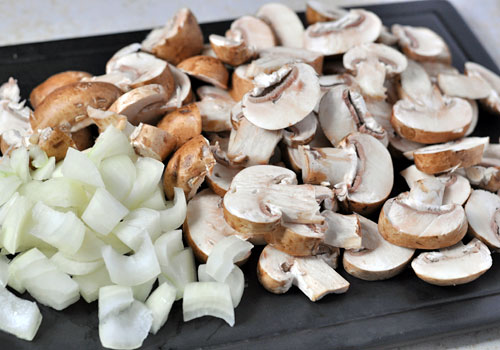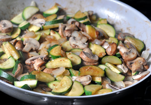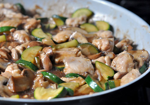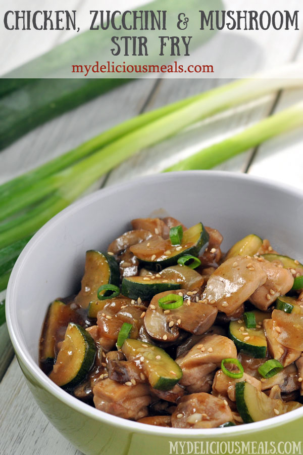 Tender pieces of chicken thighs are stir fried with zucchini, mushrooms, onions and garlic. This easy stir fry that can also be quickly prepared ahead of time. It tastes wonderful and makes a great, healthy weeknight dinner. Additional vegetables can also be added as needed. Serve with rice or noodles.