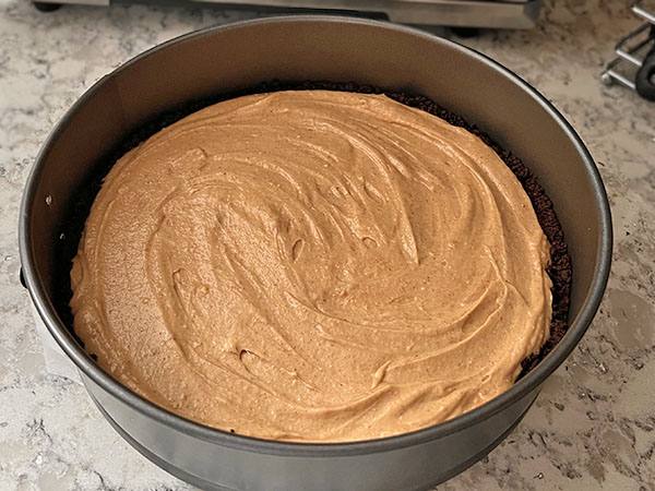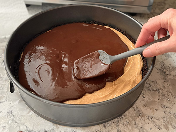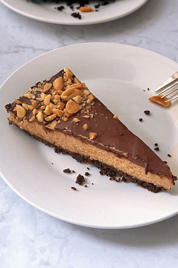 1. Prepare the crust. Add cookies to a food processor, pulse until you have fine crumbs. Add melted butter and stir well. Press the cookie crumbs evenly across the bottom and sides (about 1” high) of a 10” springform pan (I previously lined the bottom of my pan with parchment paper). Chill uncovered in the fridge until filling is ready. 2. Prepare the filling. In a bowl, beat heavy cream (look for amount under “filling”) with an electric mixer until stiff peaks form. 3. In a separate bowl, beat together peanut butter, cream cheese, sugar and vanilla extract. Stir in heavy cream. 4. Add the filling to the crust, smooth the top with a knife and refrigerate while preparing the topping. 5. Add heavy cream (look for amount under “topping”) to a saucepan. Bring to a light simmer, turn off the heat. Add chocolate pieces and cover with a lid. Let stand for 10-15 minutes. Stir well. 6. Top the cake with the ganache topping, decorate with chopped peanuts. Refrigerate for at least a couple of hours before serving.