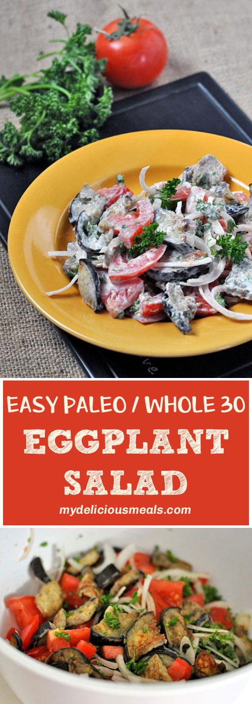 I love eggplant, it has a beautiful color and tastes great when prepared the right way. This eggplant and tomato salad has simple ingredients, but tastes so good. You can have this right out of the fridge with a piece of toast (if not on whole30). If you aren’t a big fan of eggplant recipes, this one should change your mind. As a bonus, it's paleo and Whole30 compliant.