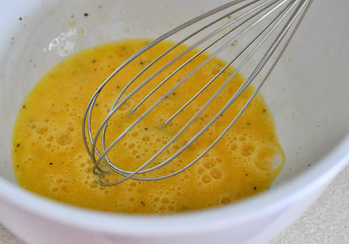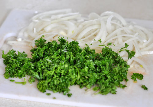1. Prepare the ingredients: cut eggplant and tomatoes into rounds, then cut rounds into quarters. 2. Thinly slice onion into half moons, chop parsley. 3. Sprinkle eggplant pieces with salt and let them sit for 10-15 minutes, then pat dry. 4. In a bowl, beat eggs with a fork. Lightly season with salt and pepper. Add eggplant to the eggs. 5. Heat oil in a large skillet over medium-high heat. Fry the coated eggplant pieces for about 4 minutes on each side (I had 2 batches). Drain on paper towels. 6. In a large bowl, toss fried eggplant, tomatoes, onions and parsley. 7. Stir in mayo; season with pepper and more salt if needed. Refrigerate.