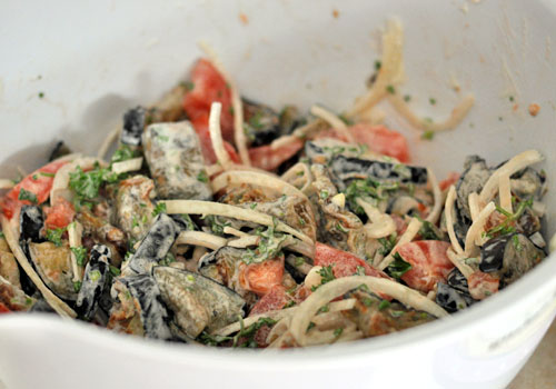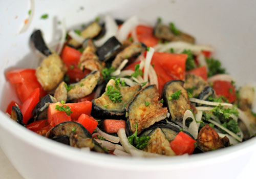 I've never seen an eggplant salad like this before. This looks DELICIOUS. Most ofter, I see eggplant that is overbreaded before being fried, which can often be heavy and greasy, overpowering the wonderful flavor of he eggplant. I'm definitely going to try this when eggplants are ripe!