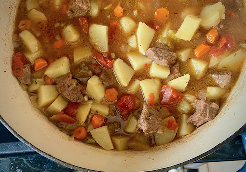 1. Cut carrots, celery and onion into preferred sizes, mince garlic. 2. Heat avocado oil in a large skillet (I used a Dutch oven) over medium-high heat. Sear beef on all sides. Season with thyme, salt and pepper. 3. Add onion, carrots and celery, cook for 5 minutes. Add garlic and cook for another minute. 4. Pour in beef broth, coconut aminos and red wine vinegar. Add tomatoes, bring to a boil, cover and cook on low for 50 minutes. 5. Meanwhile, cut potatoes. When the beef is tender, add potatoes and bay leaf, season with salt and cook another 20-30 minutes (depending on how soft you like them). Enjoy while hot.