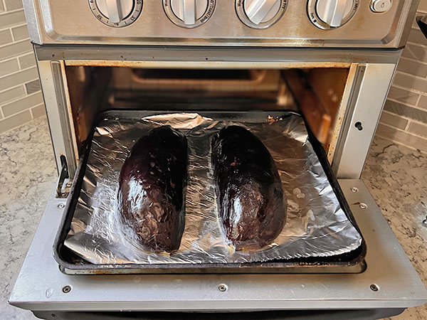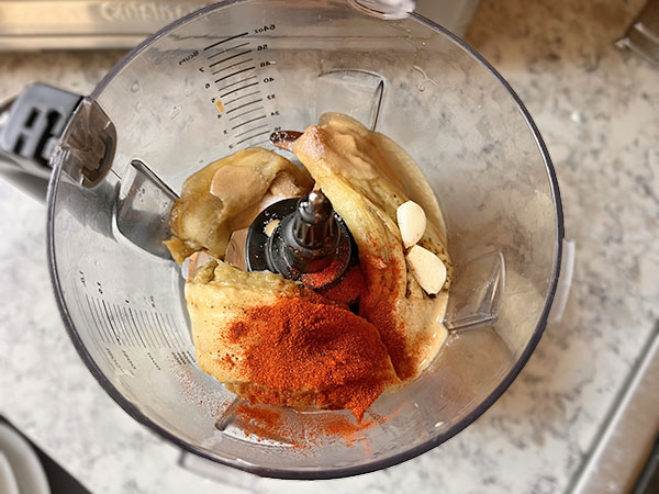 1. Cut eggplant in half lengthwise, lightly brush with avocado oil, place on a baking tray (cut side down) and broil for about 35 minutes (I use my Cuisinart Toaster Oven for this step). 2. Once cool to the touch, peel away the skin and discard. Place peeled eggplant in a food processor, add tahini, garlic, lemon juice, paprika, salt and a small pinch of cumin. Process until smooth. 3. Adjust the flavor to your liking by sampling and adding more garlic, tahini, salt, or lemon juice as desired. Use a spoon to make a couple grooves, pour some olive oil, top baba ganoush with chopped parsley and serve.