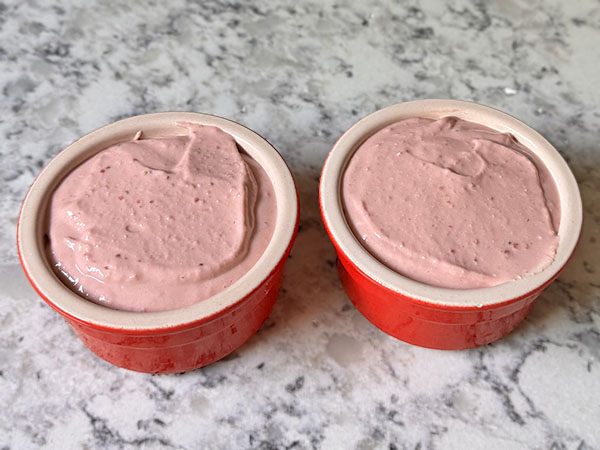 1. Preheat the oven to 350°F (175°C). 2. Place the freeze-dried strawberries in a blender cup and blend into a fine powder (you can also use a food processor). 3. Add cottage cheese, Greek yogurt, egg, pure maple syrup, flour, and vanilla extract to the strawberry powder and blend until smooth and creamy. 4. Distribute the cottage cheese mixture evenly between greased ramekins and bake the cheesecake cups for 20 minutes, or until the centers are just firm. 5. Allow the cheesecakes to cool to room temperature, then refrigerate until chilled. Garnish with fresh strawberries and a touch of strawberry dust.