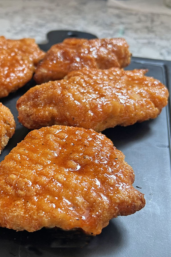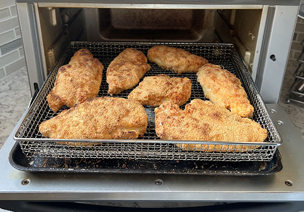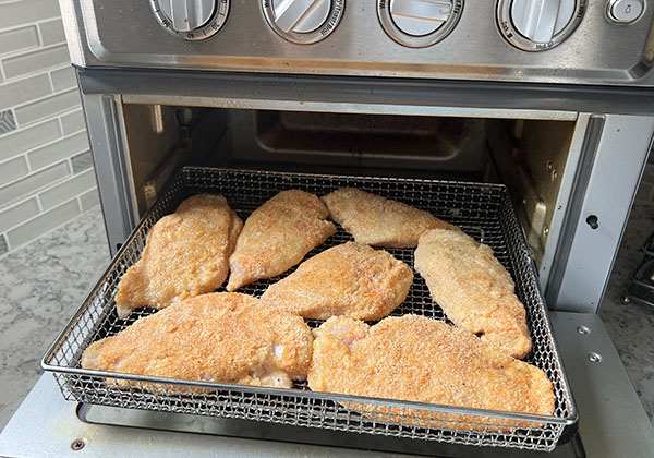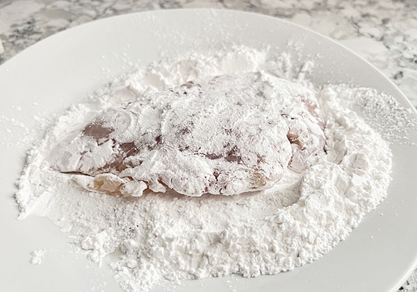 6. Dredge each chicken piece in tapioca starch, then dip in the egg mixture, and finally dredge in almond flour. Place on a baking sheet (preferably the one with wire rack). When all pieces are ready, lightly spray or drizzle with avocado oil.