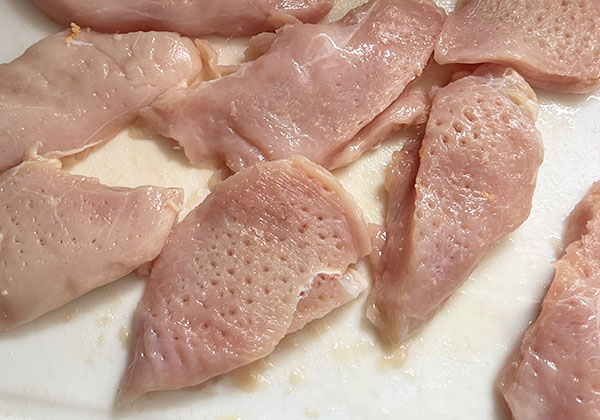 2. Cut chicken breasts in halves horizontally to make them thinner (larger breasts can be also cut vertically, to get 4 fillets). Place chicken fillets between two sheets of plastic wrap, or inside a sealable plastic bag. Slightly pound with a meat mallet for even thickness (this allows chicken to cook quickly and evenly).