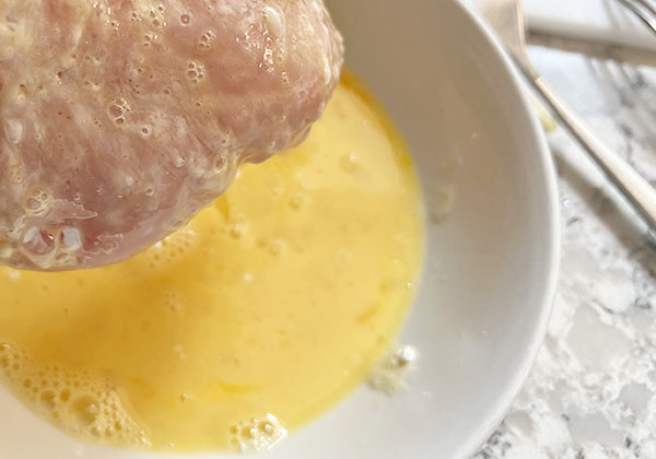3. Place eggs and a teaspoon of water into a shallow bowl, lightly beat with a fork.