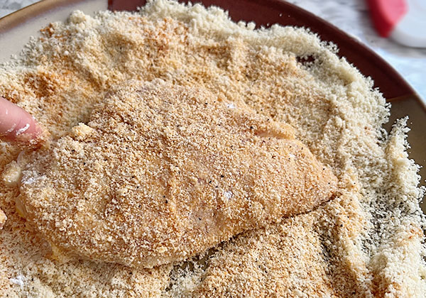 4. On a large plate, mix together almond flour, paprika, salt and pepper.