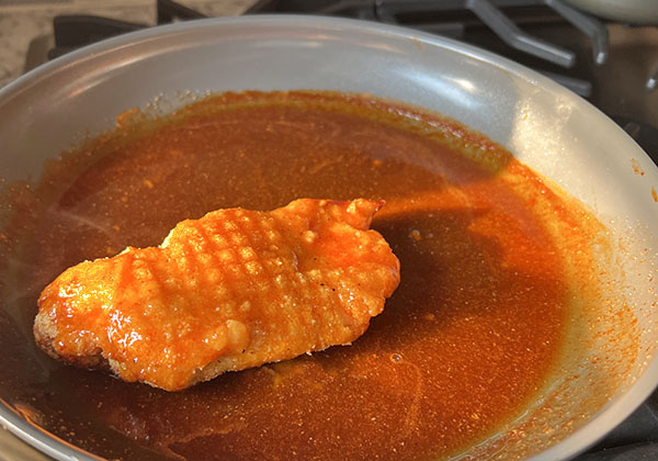 8. While the chicken is baking, prepare the sauce. Add honey, hot sauce and garlic powder to a small skillet, bring to a boil, stir and turn off the heat.
