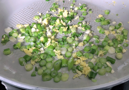 1. В миске вилкой взбить яйца и щепотку соли. В большой сковороде разогреть 1 ст л масла авокадо, добавить смесь из яиц. Как только яйца начнут приготавливаться, начать медленно перемешивать их лопаткой, снаружи внутрь, формируя кусочки яиц. Мешать пока не останется яичной жидкости. Переложить на тарелку и оставить в сторону. 2. В ту же сковороду добавить еще 2 ст л масла авокадо. Положить светлые части зеленого лука, имбирь и чеснок, жарить около 3 минут. 3. Добавить морковку, цветную капусту и кокосовый аминос, готовить 5 минут, периодически перемешивая. Добавить горошек, остатки зеленого лука, рисовый уксус, кунжутное масло и пожаренные яйца. Готовить еще 3-5 минут, пока горошек не прогреется, но цветная капуста все еще будет слегка хрустящей. Посолить (если необходимо) и подавать к столу.