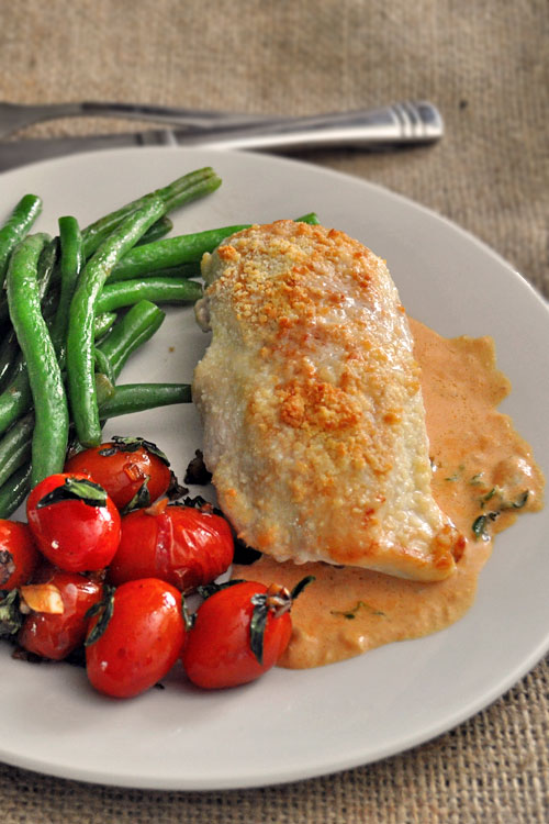 4. Переложить курицу на противень, посыпать половиной Пармезана. Запекать, пока сыр не станет золотистым, около 8-10 минут (температура внутри должна достигнуть минимум 75 Цельсия (165 Фаренгейта)).