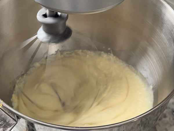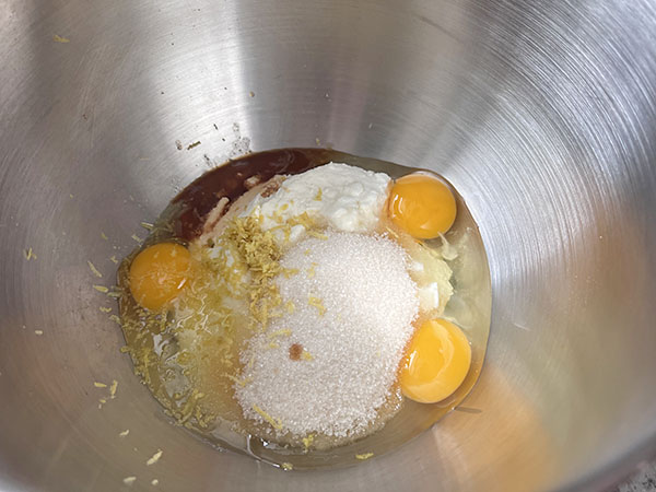 3. To the bowl of a standing mixer, add ricotta, lemon zest, sugar, eggs and vanilla extract. Mix for about 5-7 minutes, until the mixture is smooth.