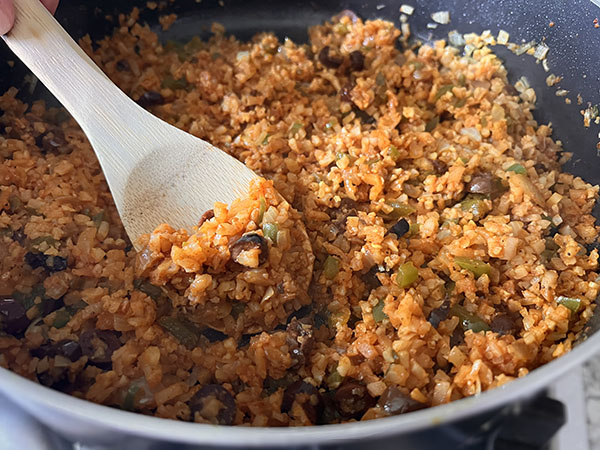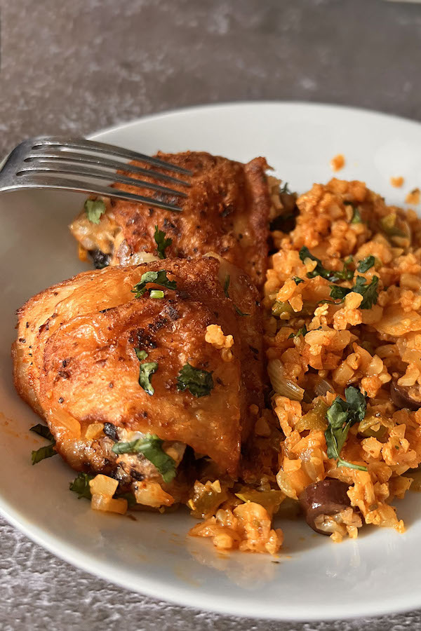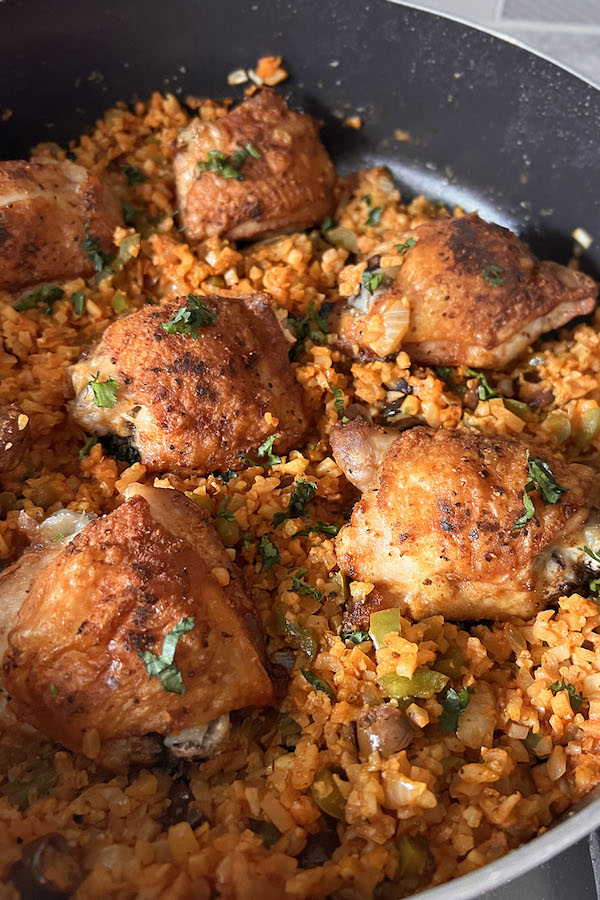 This delicious and healthy recipe for Spiced Chicken and Riced Cauliflower Skillet is perfect for those who are looking for a low-carb and gluten-free meal. Juicy chicken thighs are seasoned with cumin and smoked paprika, and then baked to perfection. The flavorful cauliflower rice is made with onions, bell peppers, garlic, kalamata olives, and a blend of aromatic spices like cumin, Italian seasoning, and turmeric. The dish is finished with a sprinkle of fresh cilantro, adding a burst of freshness and color. This easy-to-make meal is perfect for a weeknight dinner or for meal prepping.