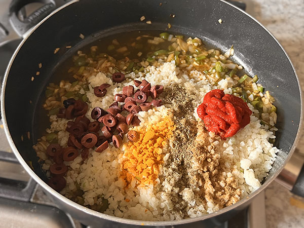 1. Preheat oven to 380F (~190C). 2. Season chicken with smoked paprika, cumin, salt and pepper. 3. Heat avocado oil in a large skillet over medium-high heat. Add chicken (skin side down) and sear for 5 minutes, turn and cook for another 2 minutes. 4. Transfer chicken to a baking sheet and bake in the preheated oven for about 30 minutes (the internal temperature should be at least 175F (80C)). 5. While the chicken is baking, add chopped onion and pepper to the same skillet. Stir well to remove any stuck pieces from the bottom. Cook for about 5 minutes, add minced garlic and cook for another minute. 6. Add cauliflower rice, tomato paste, sliced olives, cumin, Italian seasoning, turmeric and chicken broth. Season with salt and pepper. Stir well and cook on low for another 10 minutes. 7. Serve riced cauliflower topped with chicken and cilantro.