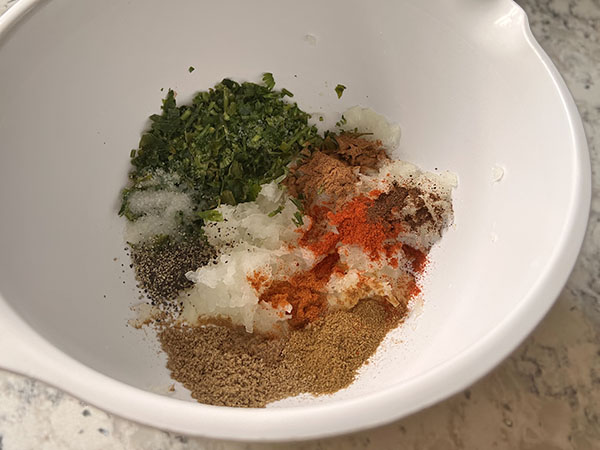 1. In a bowl, combine grated onion, chopped parsley, salt, cumin, coriander, paprika, cinnamon, black pepper, cayenne pepper and ground cloves.