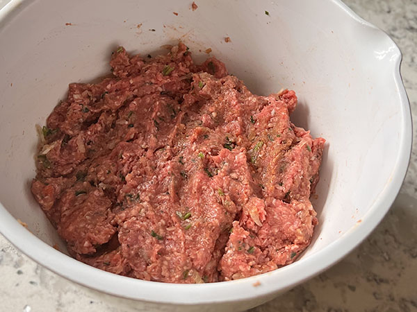 2. Add ground beef and mix well using your hands (you can use disposable food grade gloves).
