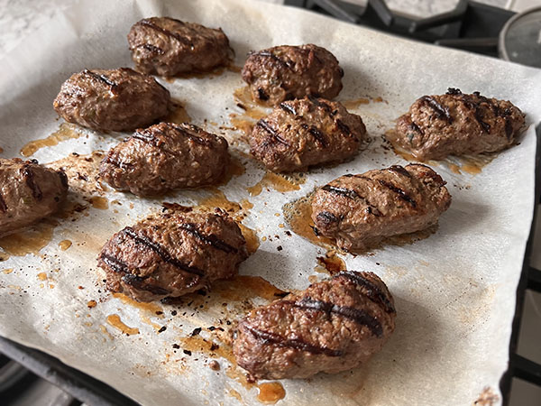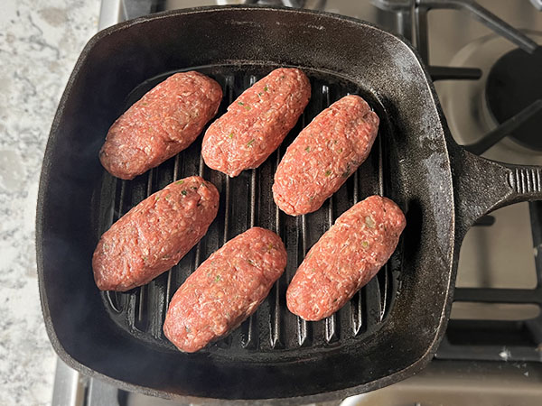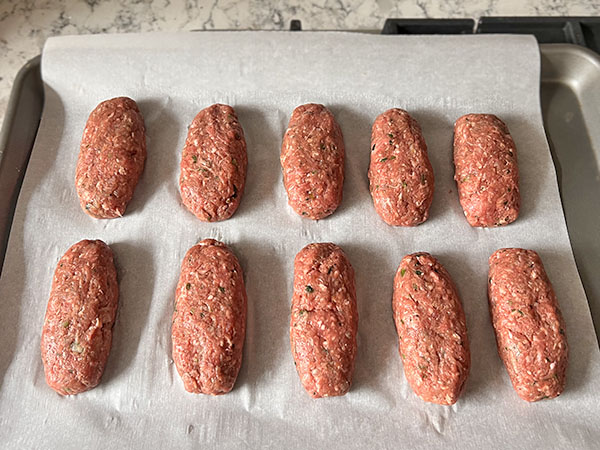 3. Shape the beef mixture into 10 logs (you can make fewer but longer logs if you prefer, they shrink when cooked).