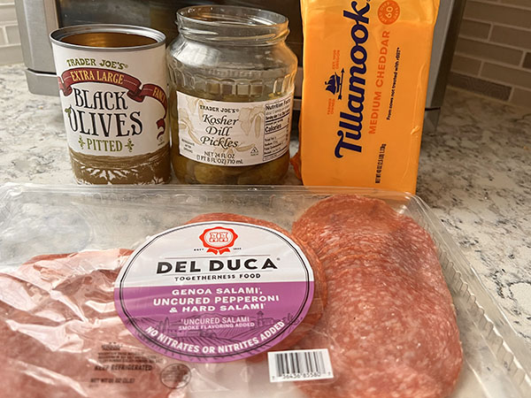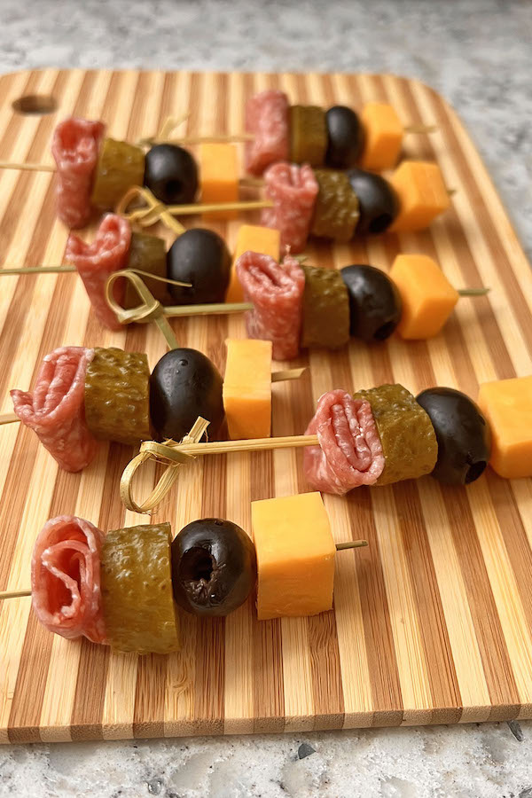1. Prepare the ingredients. Cut each salami slice in half. Cut cheese into cubes. Drain olives. Pat pickles with a paper towel to remove excess liquid, then cut into rounds (about 1/3” thick). 2. Thread ingredients onto wooden skewers (or toothpicks) in the following order: salami (roll a piece and skewer it), pickle, olive, and cheese cube. Repeat until you use up all the ingredients. Serve and enjoy!