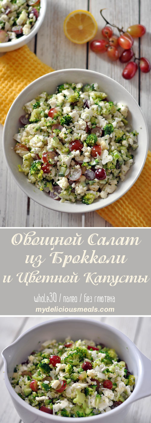 Хрустящий, полезный и вкусный салат из брокколи, цветной капусты, огурцов, винограда и лука. Все перемешано с небольшим количеством лимонного сока и майонезом. Этот салат пользуется популярностью на любой посиделке. Лучше подавать охлажденным.