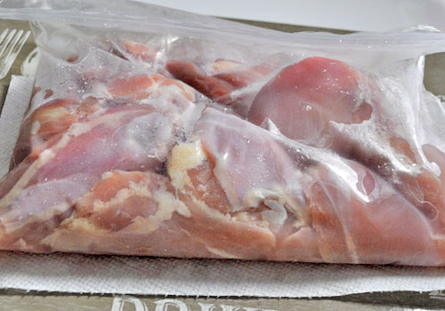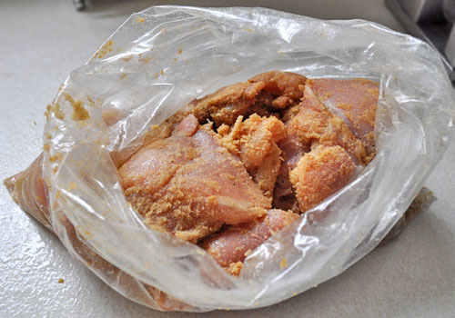 5. Open the bag, pour out the egg mixture. Add dry ingredients mixture. Close the bag, shake it and rub it to make sure chicken gets a nice coating (it will take a couple of minutes).