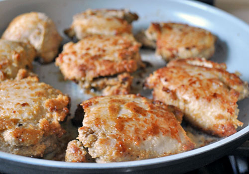 6. In a large skillet, heat 2 tablespoons ghee. Fry chicken thighs for about 4 minutes per side, until golden brown.