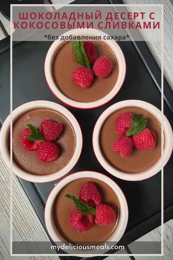 Шоколадные десерты с кокосовыми сливками - отличный вариант индивидуальных десертов и они готовятся за считанные минуты, лишь надо подогреть ингредиенты. Всего 5 основных продуктов необходимы для приготовления: кокосовые сливки, какао порошок, финики, экстракт ванили и соль. Никто не поверит, что эти вкусные мини-десерты содержат только 5 ингредиентов. Можно украсить свежей малиной и листиками мяты для элегантной, романтичной подачи.
