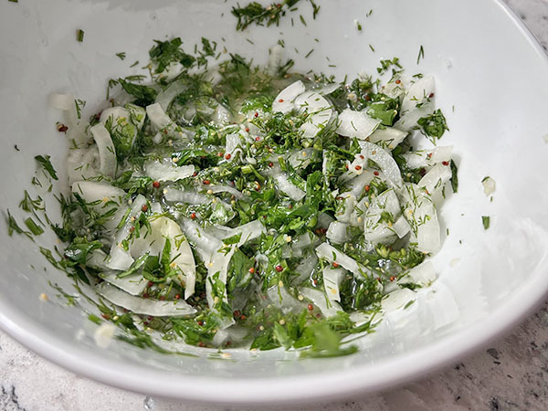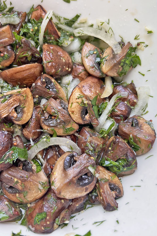 1. Rinse mushrooms and cut in halves or quarters (depending on the size). Thinly slice onion. Chop parsley and dill. 2. In a skillet, heat oil over medium-high heat, sear mushrooms on all sides, until lightly golden brown. 3. In a bowl, combine thinly sliced onion, finely grated garlic, whole grain mustard, lemon juice, salt, dill, parsley. Pour in boiling water. 4. Add cooked mushrooms, drizzle with oil, stir and refrigerate until serving.