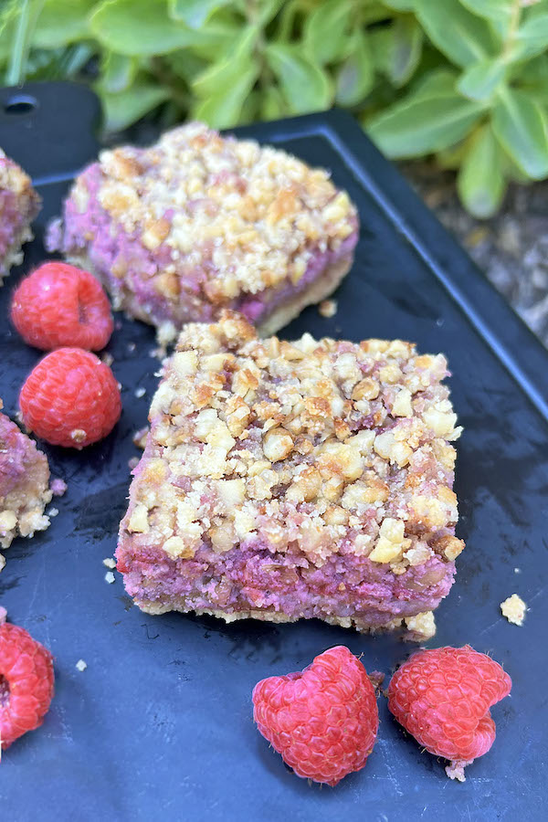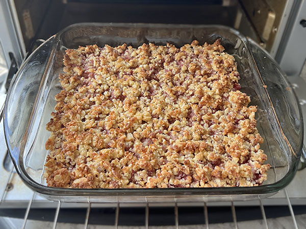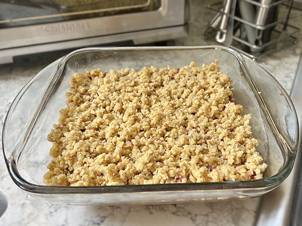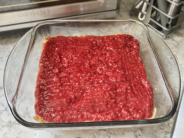 6. Once the crust has cooled, spread the raspberry mixture over the crust, followed by the crumb topping. Use your hands to lightly pat the topping down.