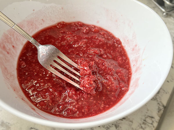 4. While the crust is baking, prepare the filling. In a bowl, combine filling ingredients (raspberries, maple syrup, lemon juice and vanilla extract), mash well with a fork.