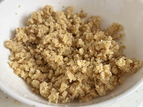 5. Prepare the crumb topping. In a bowl, using your hands, combine finely chopped walnuts, coconut flour, maple syrup and ghee.