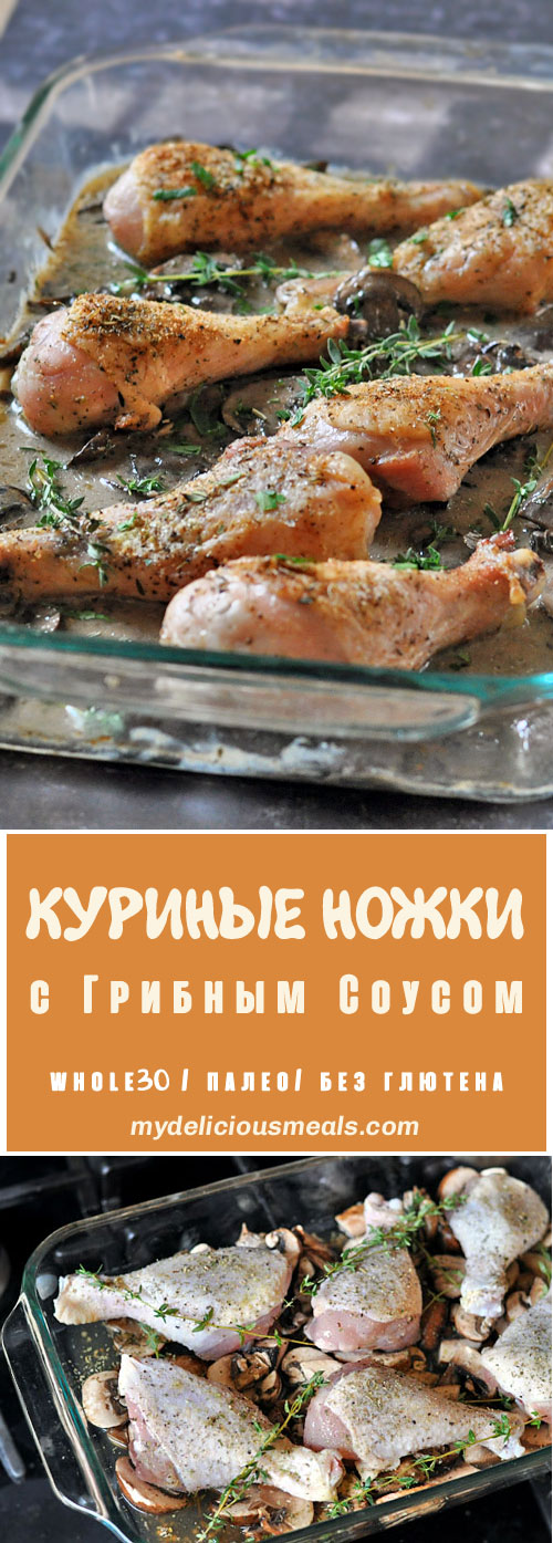 5. Куриные ножки посолить, поперчить и посыпать чесночной пудрой со всех сторон. Выложить поверх грибов. Добавить еще несколько веточек тимьяна.
