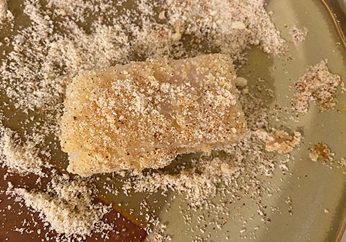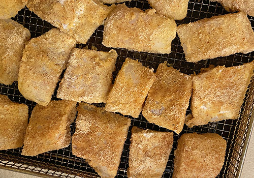 1. Разогреть духовку до 200C (400F). 2. Рыбу ополоснуть водой и обсушить бумажными полотенцами, нарезать на куски. Посолить со всех сторон. 3. На тарелке смешать миндальную муку, порошок чили, чесночный порошок, луковый порошок и кайенский перец. 4. Обмакнуть каждый кусочек рыбы в яйцо (излишки пусть стекают), затем обвалять в муке (необходим только тонкий слой). Выложить рыбу на противень, застеленный бумагой для выпечки (чтобы было расстояние между кусочками). 5. Запекать в разогретой духовке 7 минут, перевернуть и запекать еще 7 минут. Для более золотистого цвета, можно включить режим гриль (broil) на последние две минуты.
